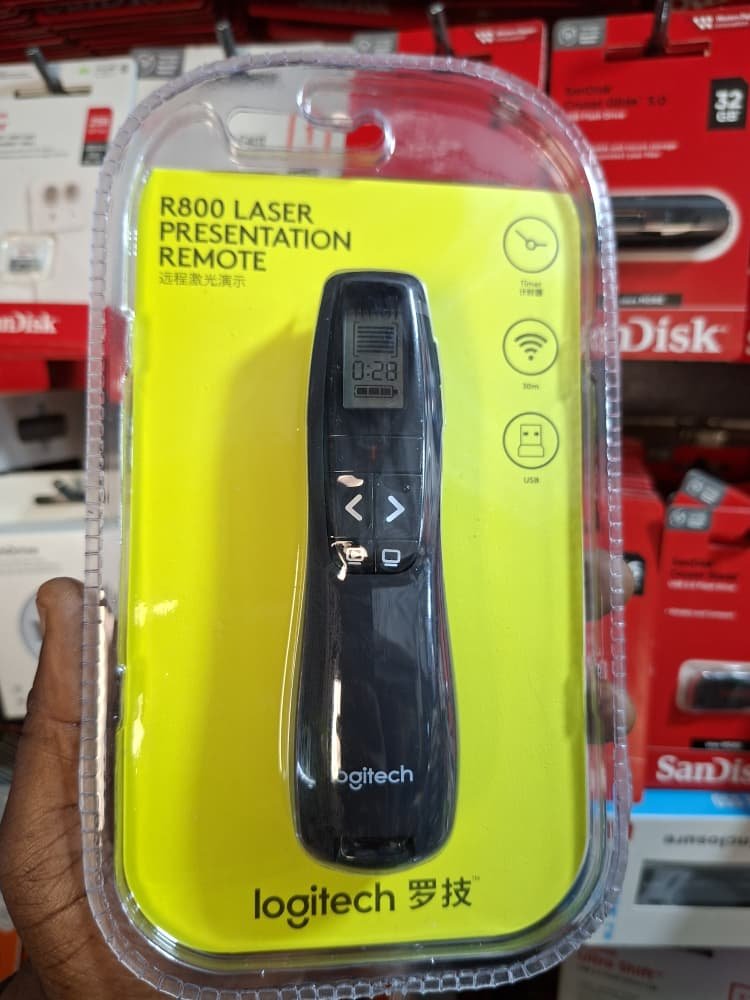 La télécommande de présentation Logitech R800 disponible chez Sylvel Accessoires est l’outil indispensable pour tout orateur, professeur ou professionnel. Conçue pour vous donner un contrôle total sur votre diaporama, elle se connecte sans fil (via USB) et offre une portée impressionnante allant jusqu’à 30 mètres (symbole sans fil sur l’image). Fini le stress de dépasser le temps imparti : le R800 intègre un minuteur avec un écran LCD discret qui vibre lorsque le temps est écoulé, vous permettant de rester concentré sur votre public. Son pointeur laser vert (symbolisé par le rayon visible sur l’emballage) est particulièrement lumineux et efficace, même sur les écrans LCD ou dans les salles éclairées. Le R800 vous assure des présentations fluides, professionnelles et maîtrisées, de A à Z. »